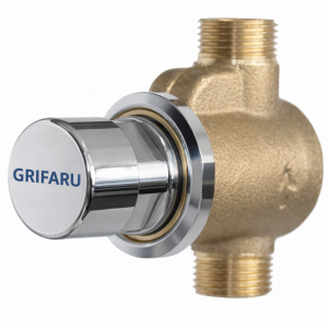 Rociador, mezclador y pulsador temporizado en latón cromado. Conexión mediante latiguillos. Con economizador de agua en la salida: Regulador automático de caudal de agua a 6 l/min. con independencia de la presión de suministro. Cierre temporizado automático.